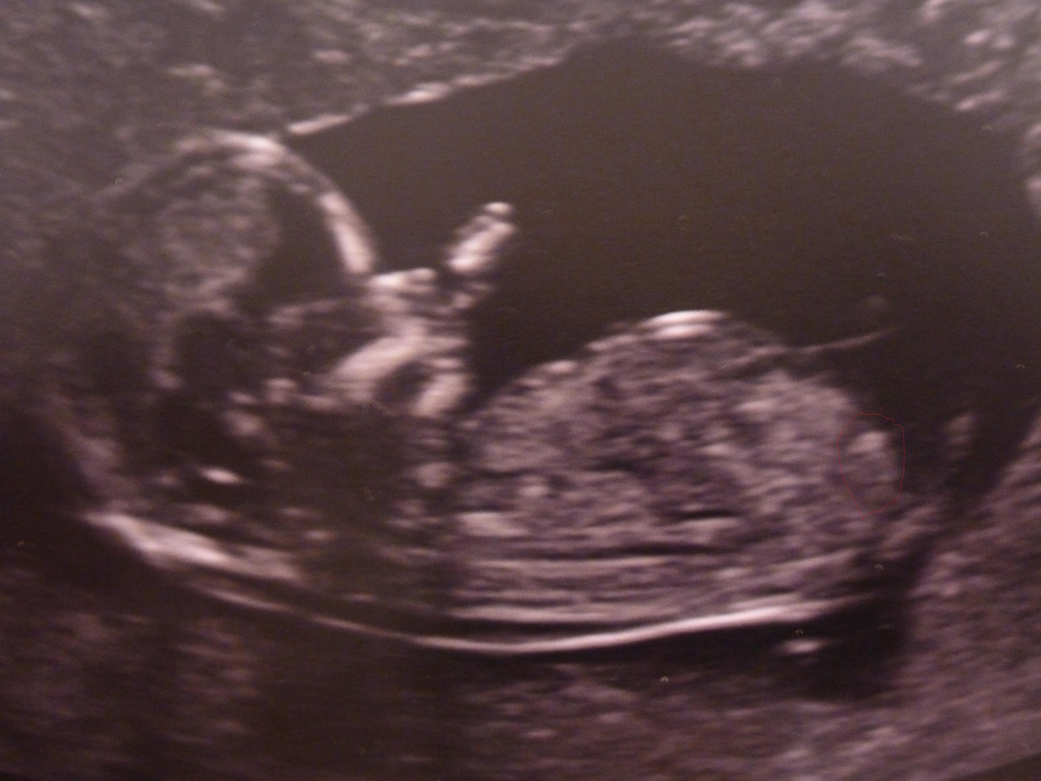 That is what I was thinking. After seeind someone elses post say the sonographer explained that we should be looking for a 'white trianglarish shape' and I compared it to my scan photos and found something similar in a similar spot but it seems to be pointing up whereas the other post was a girl and was pointing horizontal. I am hoping for my husband that it is a little boy.