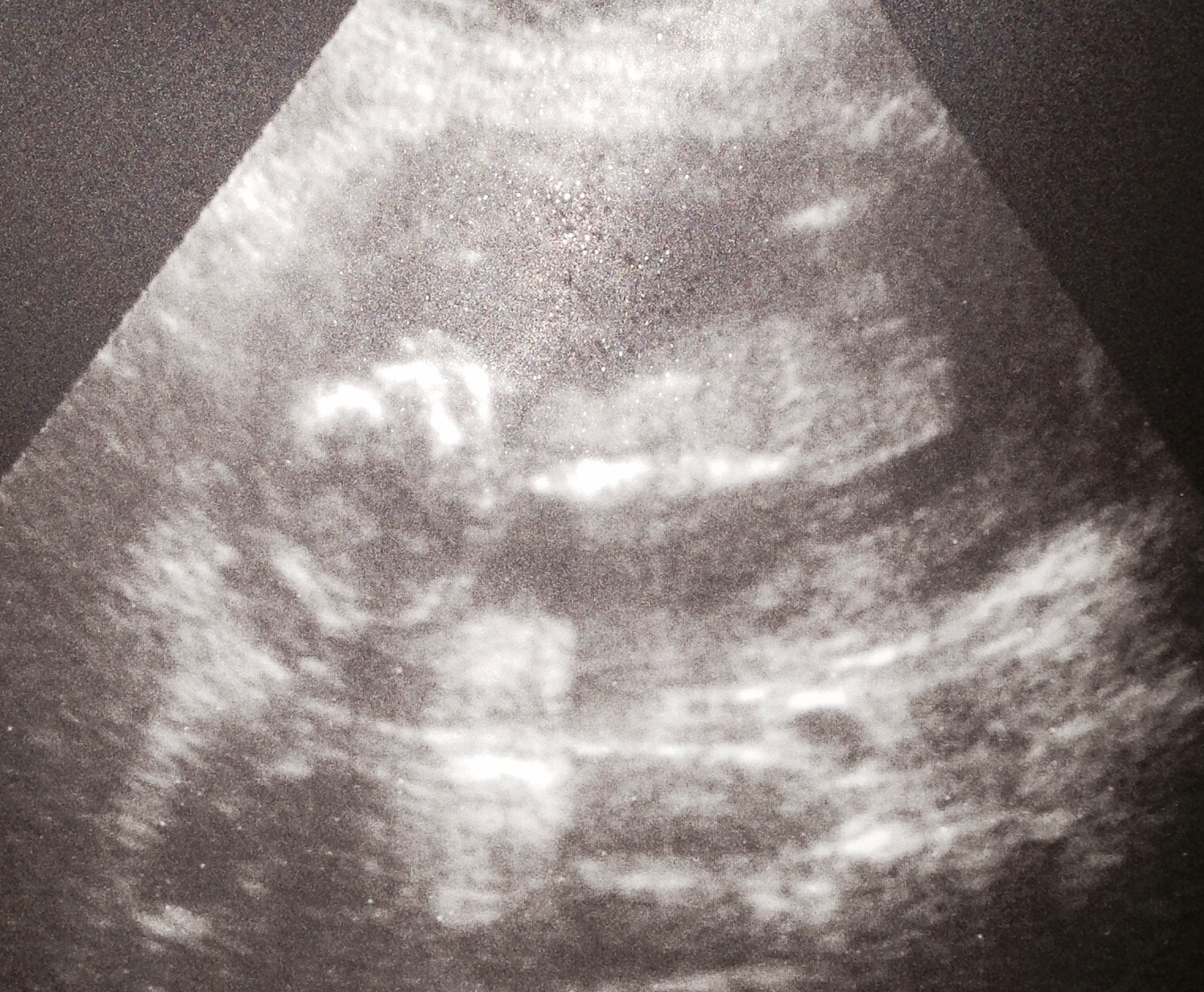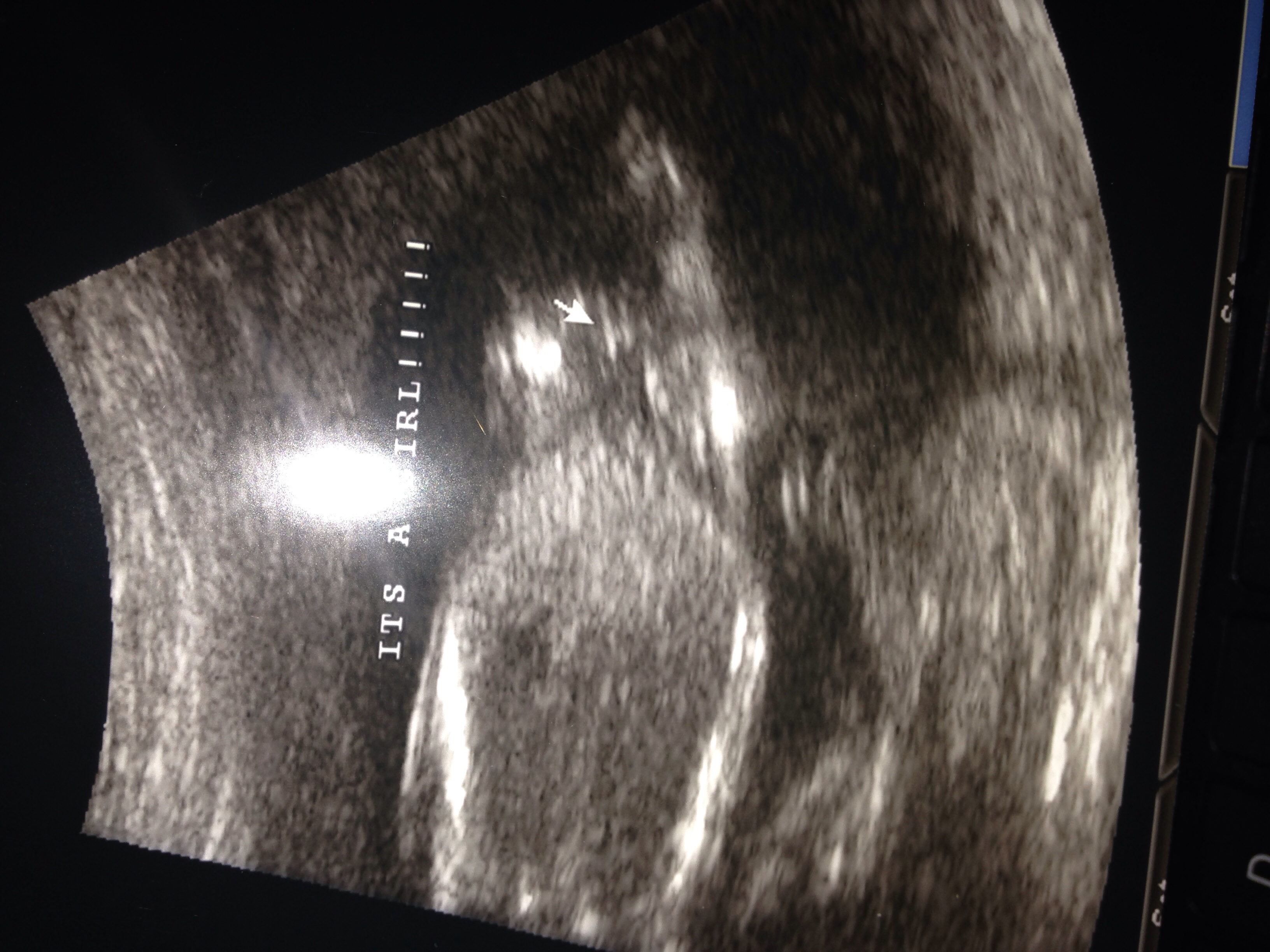 This is from 15.5 weeks, the tech said girl, but we only got side/top views, no potty shots at all. Also the legs were crossed the whole time. At the end the knees came apart for like 10 seconds and she called "three lines" now to me, the arrow is pointing way to far Down in between the legs to be a vagina right? Seems like cord to me. I don't see a penis at all, but this still seems off. I also put up my profile shot for skull/nub. I am so confused....uuugghh, help :)