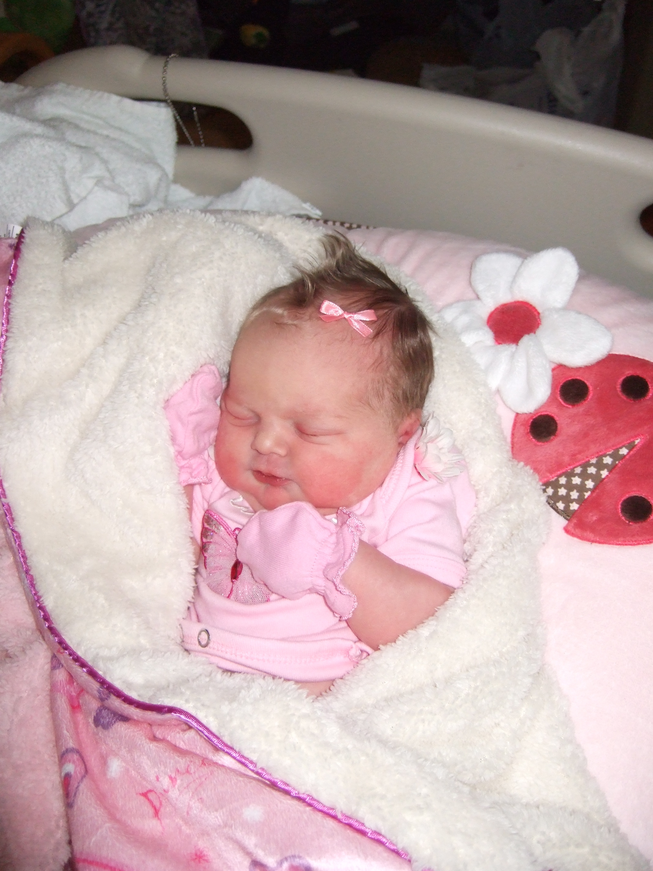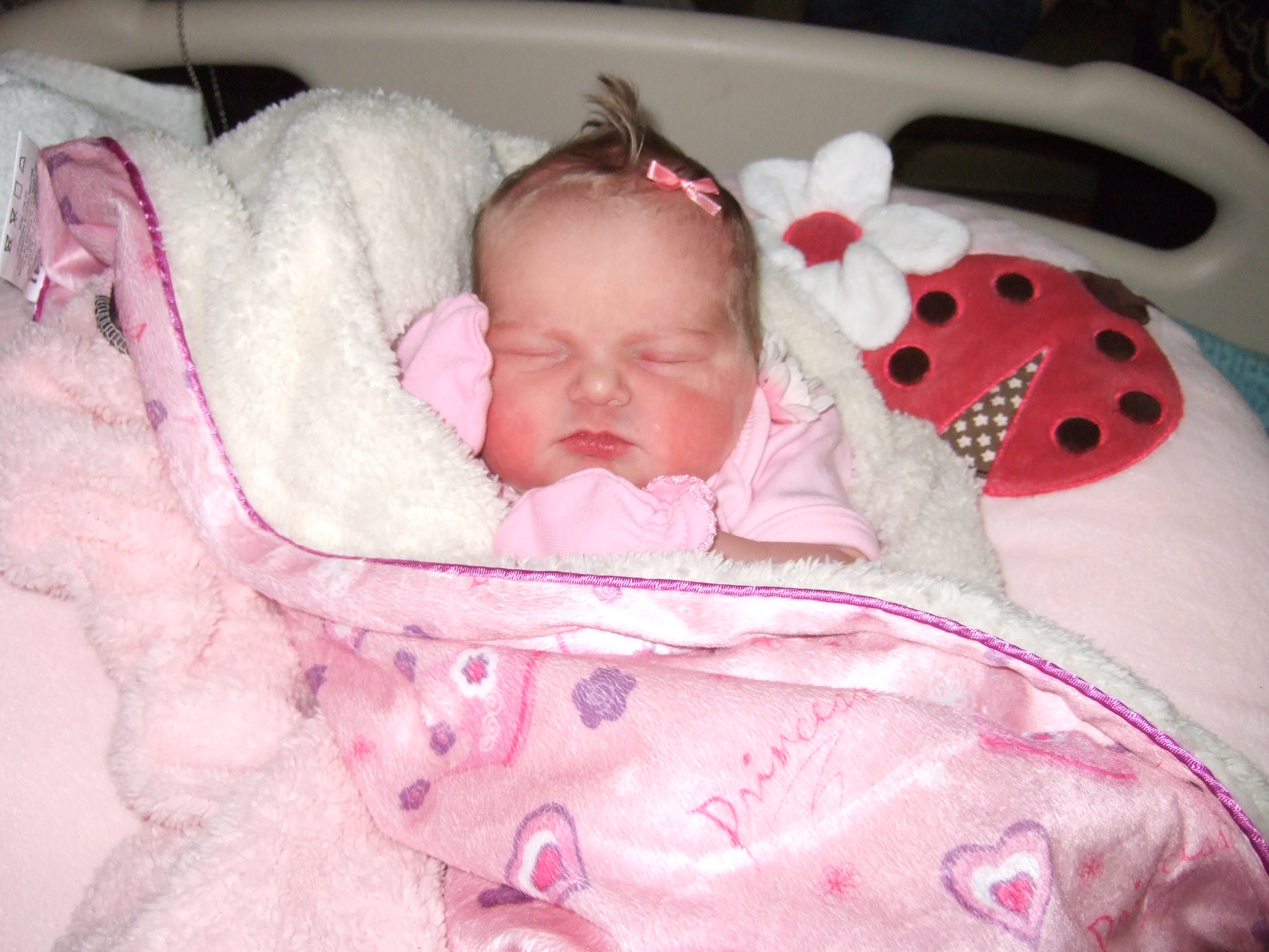 After the numbness set in I was SO happy and I really could not feel the hemmoroids at this point I had not slept in 24 hours and I was just so happy to be numb and kind of rest. My DH was still not at the hospital.. and around 4 my labor stopped and the nurse said my doc wanted to just do a little pitocin to get it going. I asked if we could wait a half hour because my DH wasn't there. After that time though they went ahead and administered it. For the next 2 hours I had the 3 min contractions that I could not feel. At this time I was feeling this strange internal pressure that was painful and I kept thinking the epidural was wearing off. DH finally got there and I am not sure how long he was there but the nurse checked me and I was complete! So that weird internal pressure was my baby saying "I'm ready mom!" My daughter was SO ready to come out and I could feel it!!! My mom and sis weren't there yet so I was freaking out! They got there finally after what seemed like forever, and they brought my boys! I wasn't expecting that scenario at all. But this was a HUGE L&D room that was pretty new and half of it was curtained off for other family to hang out and wait in. Plus my sister had never been present during a birth but I think my mom convinced her to since this would be the last time. My boys were pretty wild..running around and playing with the curtain and I thought there's no way that they will behave while I was pushing. My daughter was like arching her little back towards my stomach and causing an immense amount of pain. I had never felt anything like it before.. The nurse claimed that she saw my doc and told him that it was time, but we waited for one hour for his ass. Pardon my french. And this happened with DS#2 as well. It's like if you have a night delivery in the hospital, your doc is at home and you have to wait for them to get to the hospital.. that's how it has felt for me the last 2 times anyway.. and I just laid there and DH was fuming that the doc was taking his sweet time..it was deja vu all over again! Finally though he got there and to all our amazement.. he set up the bed to deliver and said on that next contraction let me know and we will start to push.. and right after he said it I said "Ok there it is!" So I pushed as hard as I could.. during that one contraction on push two her head was out, and push three she was OUT! It was a bittersweet moment because the nurse and I had talked all day and I found out that she had 3 older boys and that they weren't having anymore babies. I felt bad at that moment and sad for her, and she took my baby from the doc and I heard my daughter cry for a few seconds and then the nurse took her from the doc and said "Here, lets take you to your happy place." and she set her on top of me and said "There, is she still a girl!?" And I looked at her little genitals and with tears of joy I said "yes" And at that moment she shut off her tears immediately and it melted my heart. She knew I was her mamma! I put my hand over that little sweetheart's back who had opened her eyes to look at me! I just couldn't stop the happy tears as I said "Hi little sweetheart, you are so beautiful! and I love you so much!" She never stopped looking at me. I had never had one of my babies look at me for at least a day, so this was such a special and wonderful moment that I won't ever forget. I couldn't believe all the hair she had! And she seemed tiny to me like my boys.